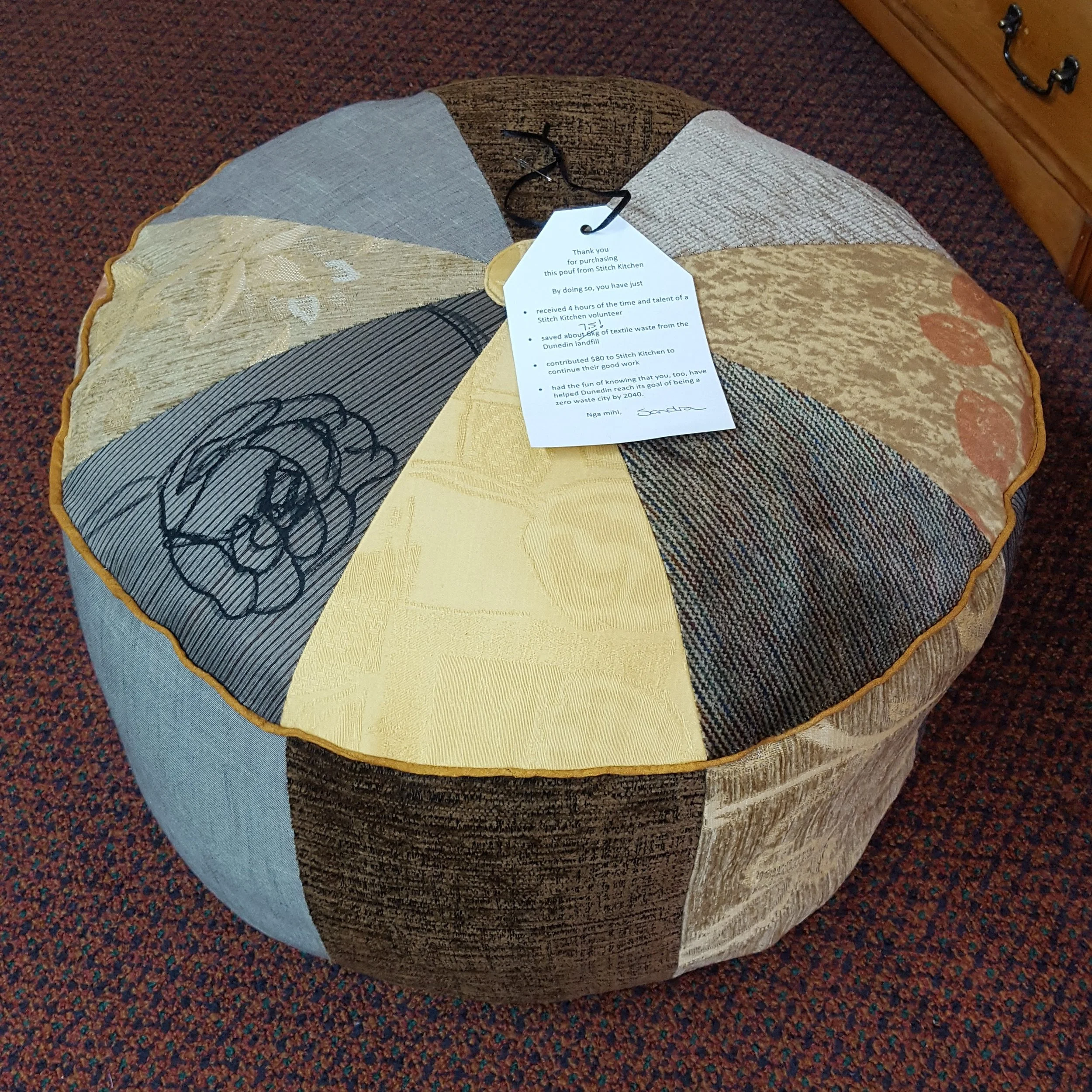 Pouffes are now in regular production, with each one looking more beautiful than the last as we get more adventurous with fabric and colour combinations - even incorporating our stash of jeans parts from previous upcycling projects to create side pockets ideal for stashing TV or stereo remote controls - or your sewing kit for each reach while you’re relaxing on the couch.